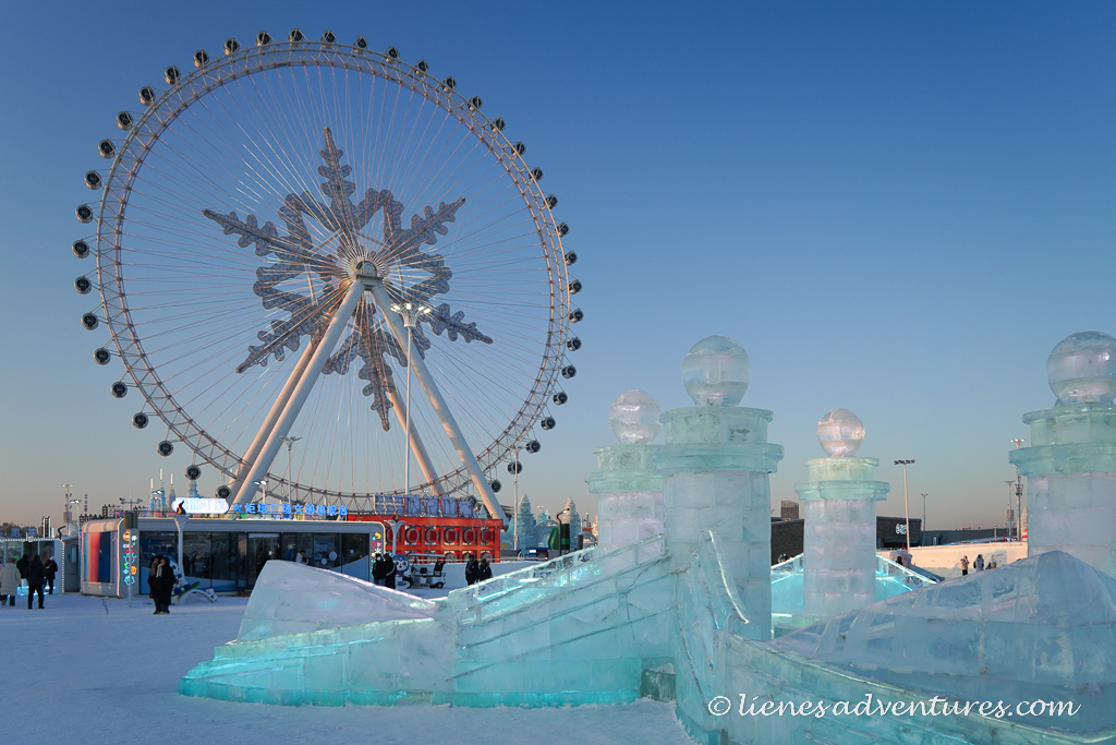The work the ice sculptors had done was astonishing! Glossy, blue ice buildings stretched into the sky. There were ice cathedrals, ice vehicles, ice houses. And to stick with the theme, the walkways and stairs leading to attractions all around the festival grounds were also cut out of ice and snow. If you slipped and fell on your butt – that was on you, so be warned!