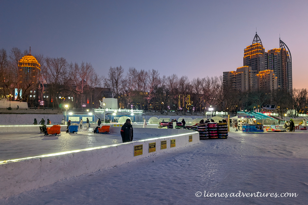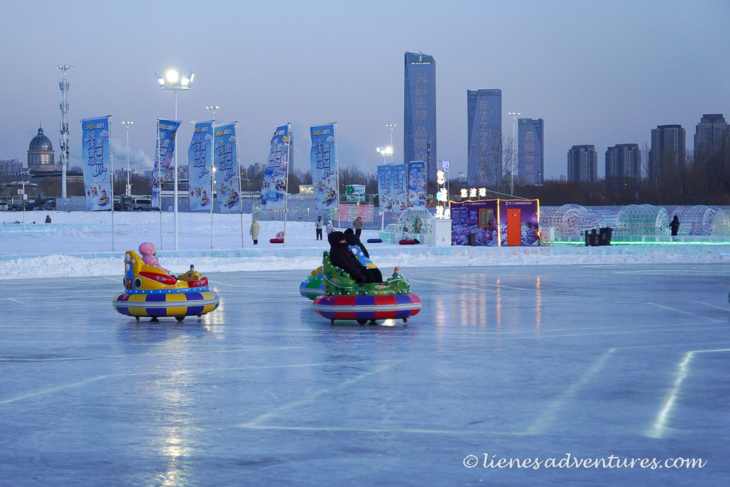 They had skating and ice bicycles. Sledding and snow tubing. Ice bumper cars and large snow tubes pulled behind cars… Many of these activities were the same ones we had already experienced at Snow and Ice World and at the Snow Sculpture Art Expo. Except here, they all required paid tickets. It was a good option to try out some rides for those who did not attend the main events and just wanted to have some fun. As we had done plenty of these activities free of charge over the past 2 days, we just took a short stroll through here, taking in the festive atmosphere, and then headed on.