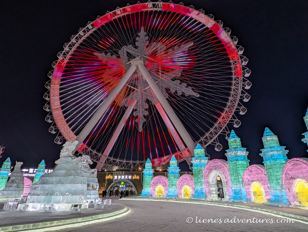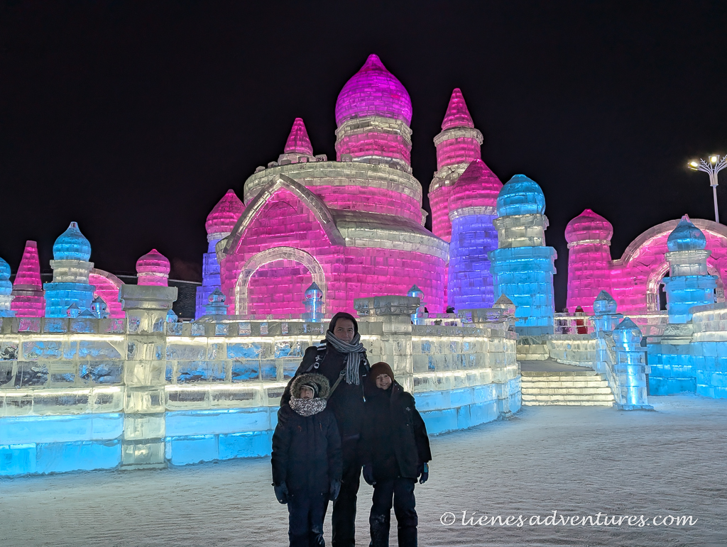After we exited the theater building an hour and a half later, a whole different world awaited us outside! The sun had set, and all the ice sculptures were illuminated in various colors. It looked amazing!