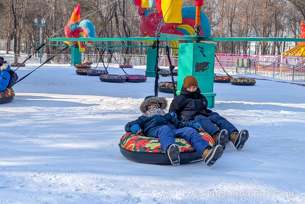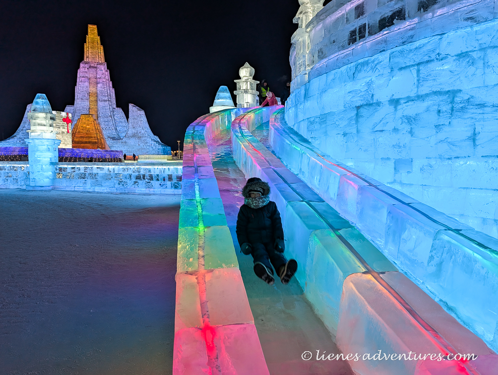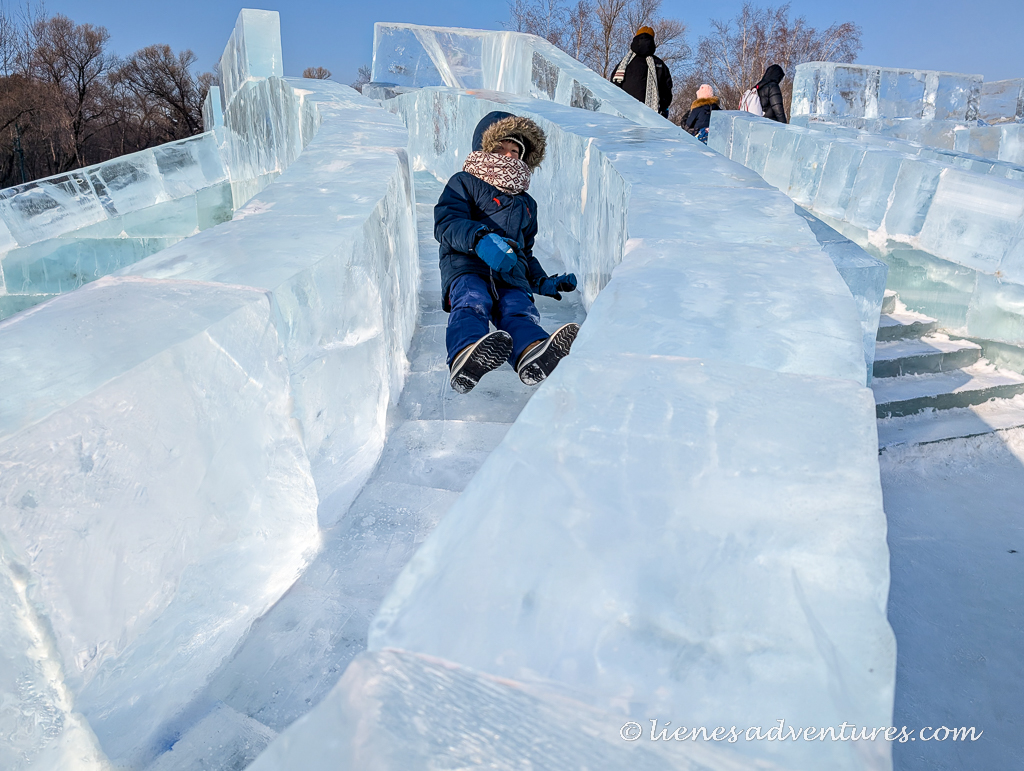 There were also plenty of other things to do, apart from admiring the sculptures. The festival grounds had various shapes and sizes of ice slides for both kids and adults. And my boys took full advantage of them!