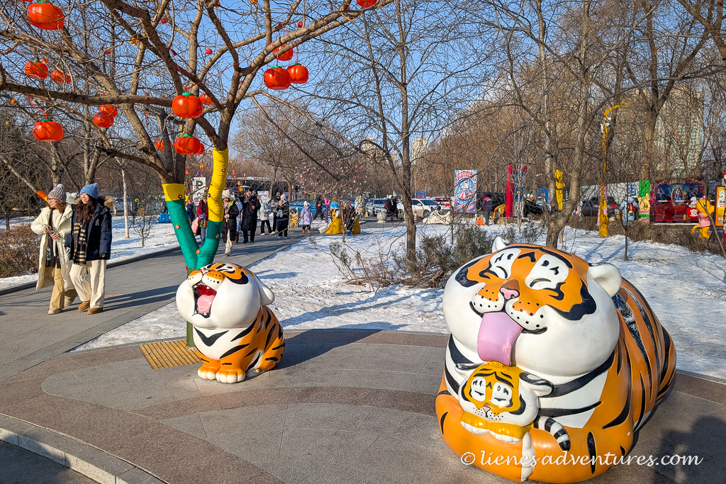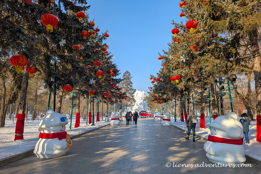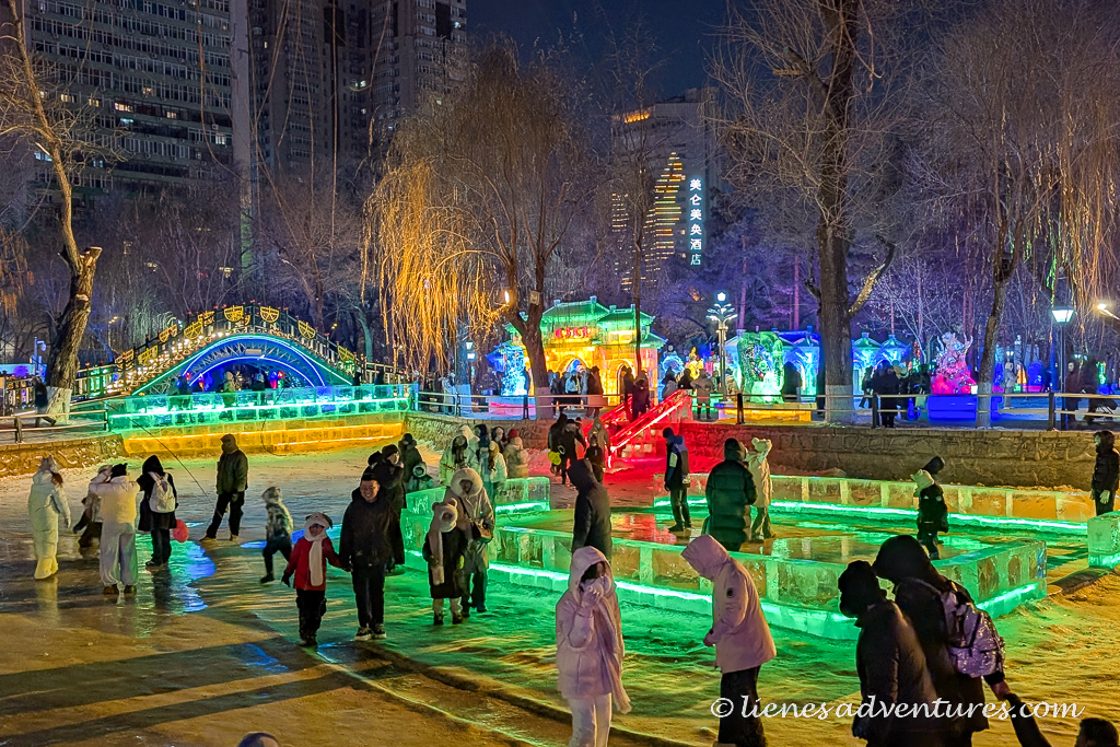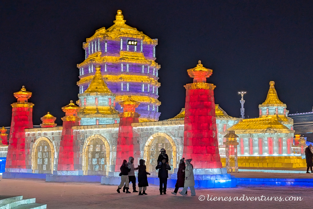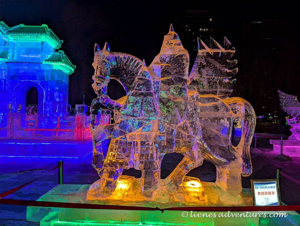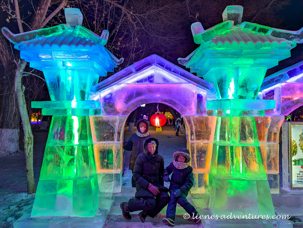 As we arrived here after dark, all the ice sculptures were lit up like lanterns along the park’s pathways, hence – the Ice Lantern Show. And they weren’t any less spectacular than at other venues. The details were very intricate and truly impressive. Zhaolin Park wasn’t big, so we made sure we walked every path and saw each and every one of the sculptures.