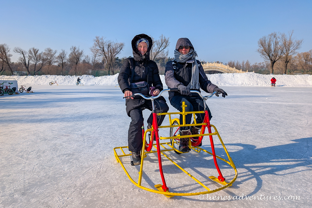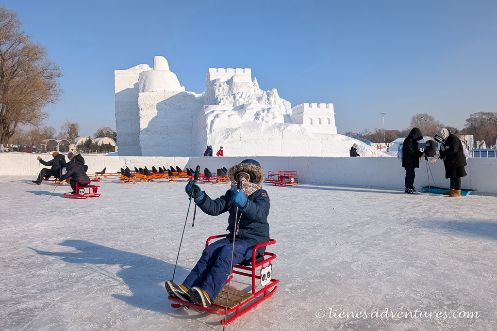 Just like yesterday, there were many activities for visitors at this location as well. Of course, my boys did not pass up a single ice slide. But we could also try out ice bicycles and ice sledding.