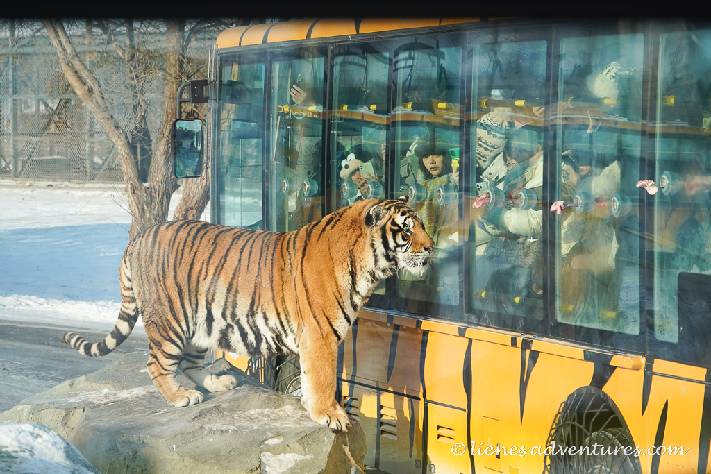 We purchased tickets to board a sightseeing bus for up-close encounters with Siberian tigers. For an extra charge we could feed the tigers meat strips via window holes. Kids had a ton of fun doing that. But I have to say that these tigers were a little chubby and picky. Wouldn’t you if you had rolling meat buses drive by all day long?