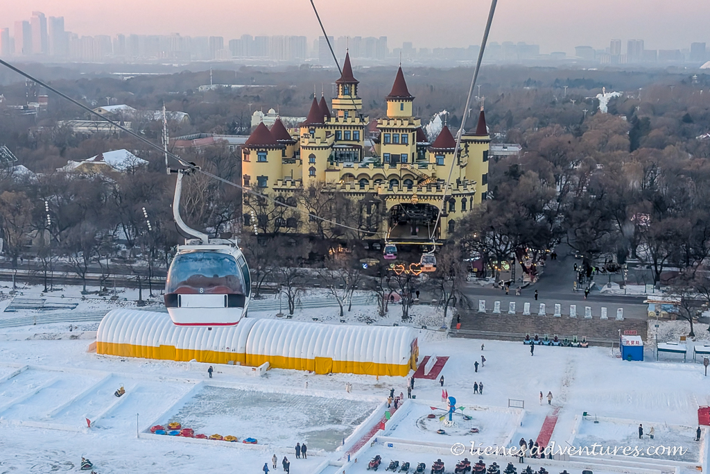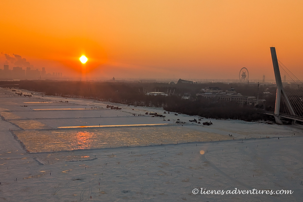 While we arrived at Sun Island via subway, I wanted to take a slightly different mode of transportation back to the central part of Harbin. Somewhere here was a cable car (gondola) going over the frozen Songhua River, offering beautiful views of the landscape. We approached a security guard at the park’s exit. Using my minimal knowledge of Chinese phrases in combination with hand gestures, we inquired about the direction of the gondola entrance. He pointed straight, but then he pointed left and started talking enthusiastically. Hmm, so is it straight or left? He just nodded and pointed left. We started walking left, but he held us back, pointed straight, but then pointed to the left again. We were so confused. Braving the hold, I pulled off my gloves and dug into my bag for a phone with a translator app. I could barely push any buttons, but at least we figured out what he was trying to say. The gondola entrance was straight, but the guard was trying to tell us that if we hurried, we would see a beautiful sunset coming from the left as we rode the gondola. Chinese people were really very helpful and sweet!