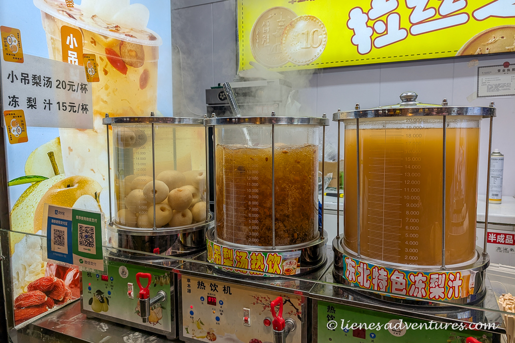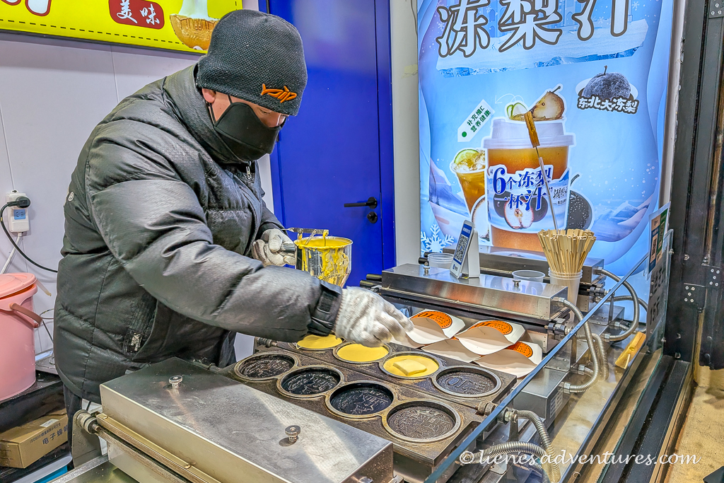 We decided to buy a “Gold Medal” – a traditional Harbin treat that consisted of a slightly sweet pancake / waffle looking thing stuffed with hot, stretchy cheese. They made them right in front of us, so we got steaming, hot “medals” which were really tasty and warmed us all up quickly.