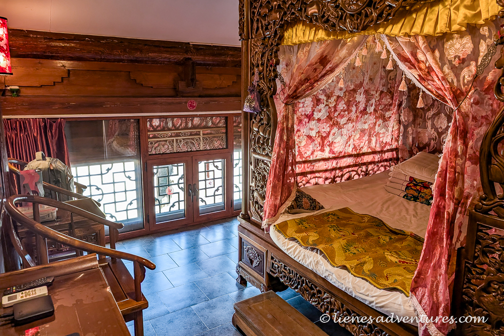 The complex contained three large courtyards, six small courtyards, and 197 rooms in an area of 0.6 hectares. It was a traditional wealthy, large-family Chinese residence with Qing Dynasty décor. It almost reminded me of our hotel room...