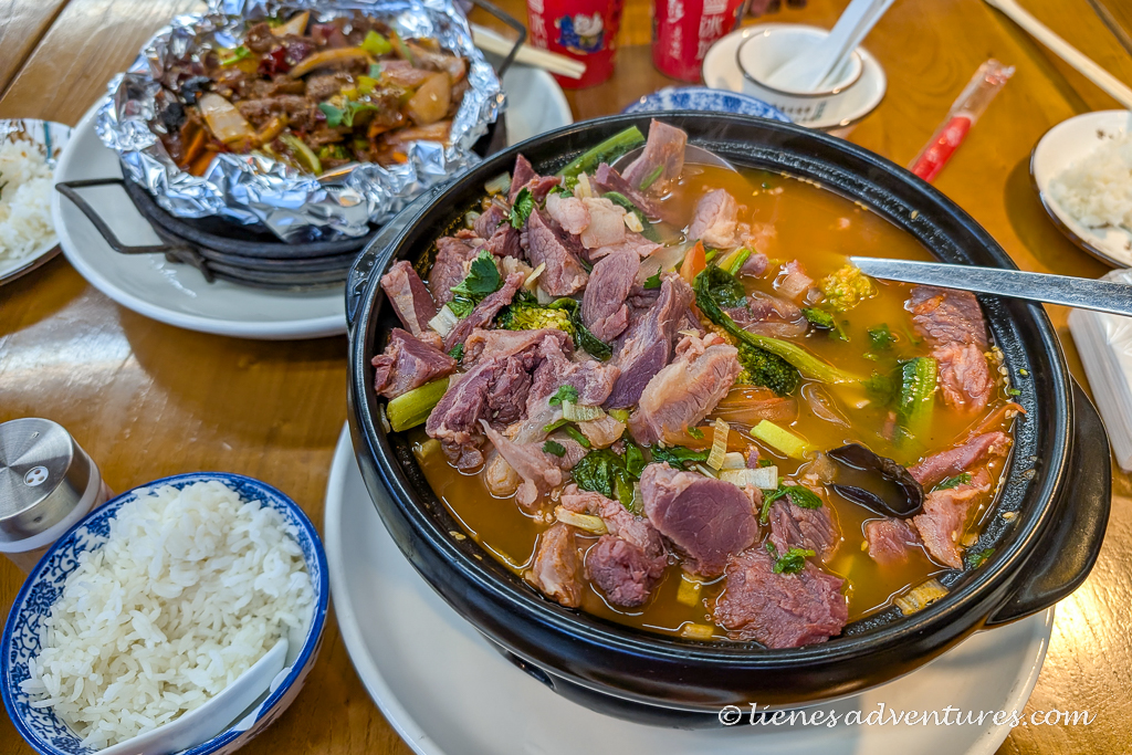With all ticketed attractions closing at 17:30, we were on our own again. And as we slowly walked the evening lit streets of Pingyao, we realized we had not had any decent sit-down meals since breakfast. There were so many choices, but as most of the offers were quite similar, we just chose one along the way. What I thought would be one serving of beef soup was a whole pot of it meant for sharing! With my kids and husband having ordered their own plates of food, we ended up with a lot more food than we could ever manage to eat! This was our new lesson of the day – some plates in Chinese restaurants are not single servings but an order for the whole table!