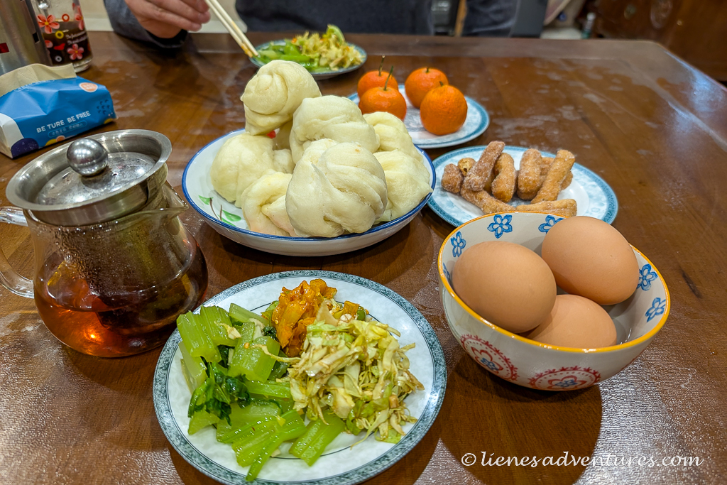Although we would have loved to sleep in longer, our hotel’s owner had informed us at check-in that breakfast was served between 7:30-8:30. Upon our request, he extended it to 9 just for us, but we could not keep them waiting any longer. And maybe that’s a good thing. Otherwise, we might have slept in until noon and lost half a day… Hotel’s breakfast was a home-cooked meal by the owner’s mother with traditional Chinese meat buns, eggs, tea, coffee, and vinegar salad.