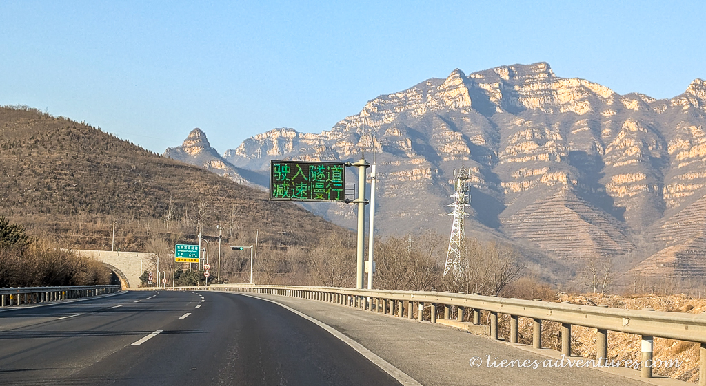 The drive to Pingyao was over 600km (370mi) long with about 7 hours of drive time. To avoid Beijing holiday traffic, we left at 5 in the morning. It was still dark outside, however, the roads were empty. Chinese do not like getting up early, so we used that to our advantage. It took us an hour to get out of Beijing proper, until we hit the main expressway south, leading us all the way to Pingyao. As the sun was coming up, we enjoyed the changing landscape outside the car windows. This was our first long China road trip, so everything was new and exciting. The flat landscape slowly changed into a mountainous one with many tunnels.