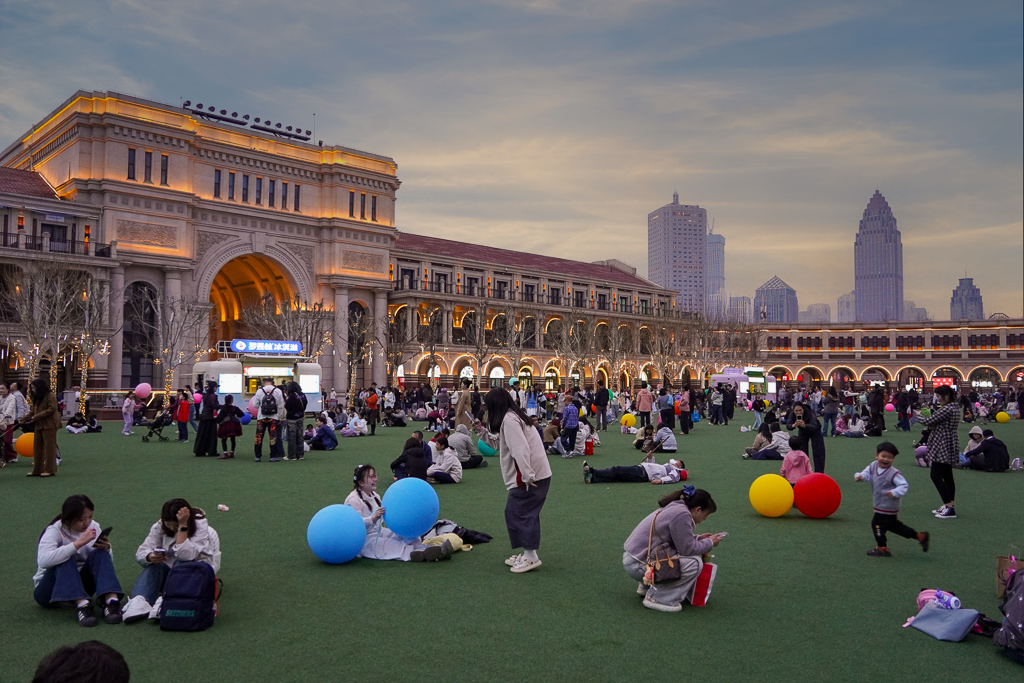 Tired and hungry, we found ourselves at the Minyuan Square area. Originally built in 1920s as a British sports stadium, it was now a public park with shops and restaurants. As we had not properly eaten since getting Goubuli baozi at the Tianjin Eye in the morning, we started looking around for a place to have dinner. Meanwhile, the kids got some oversized balloons from a street vendor and started playing with other children in the park.