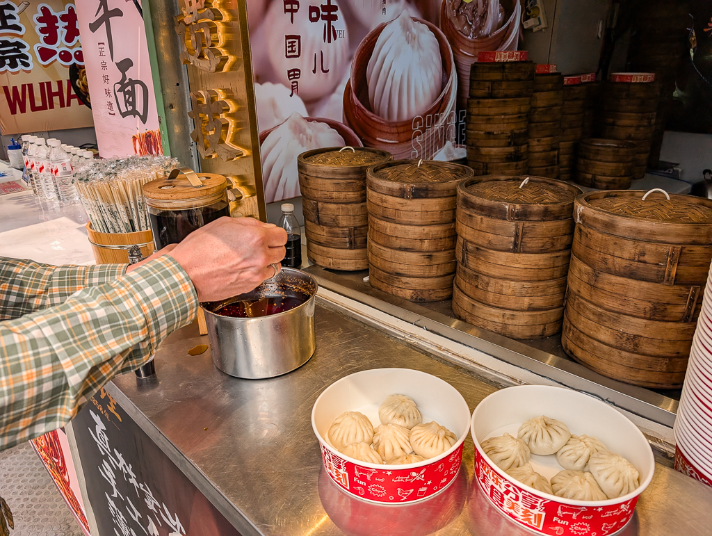 But then something else caught my attention. A stuffed glutinous rice pastry with honey and powdered sugar. I got 3 to try and we ate them all right there by the stall. They were so delicious that I went back and ordered another 3 to take along with us. While we were standing by the street, rearranging our backpacks to find a place for my pastries, the sales lady walked up to us with a baggie of another 5 pieces and gave them to us as a gift. She was very impressed that we loved her dessert so much that she wanted to give us more of it. People in China are just so sweet and kind!