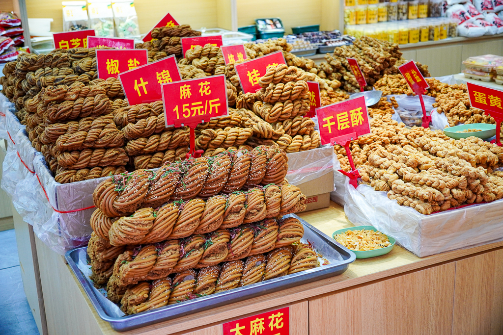Mahua (fried dough twists) seemed to be a very popular treat here, which we could not pass up. They came in both sweet and savory flavors and after sampling a few, we decided to go with the pistachio and walnut ones. They ended up traveling home with us and quickly disappeared with coffee the next morning. I wished I had bought more of them as I had not come across these little snacks anywhere in Beijing yet. But they were tasty!