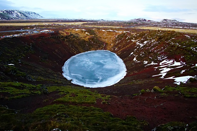 Having spent some time at Gulfoss it was time to move on to our next and last stop on the Golden Circle – a volcanic crater lake called Kerið. However, before we could even get there, I was yet again carried away by the beautiful landscape along the way and had to make my husband pull over for several photo stops (God bless his patience!). One can experience everything here – from green fields to snow covered mountain valleys.